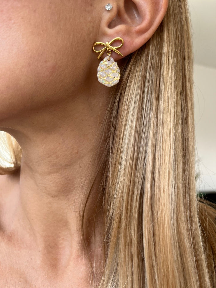 Boucles d’oreilles composées de clous petits nœuds dorés en acier inoxydable, et de jolis pommes de pin en pâte polymère.