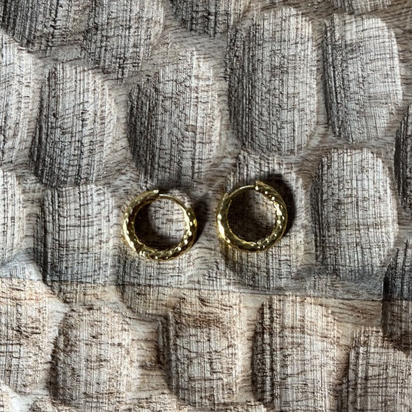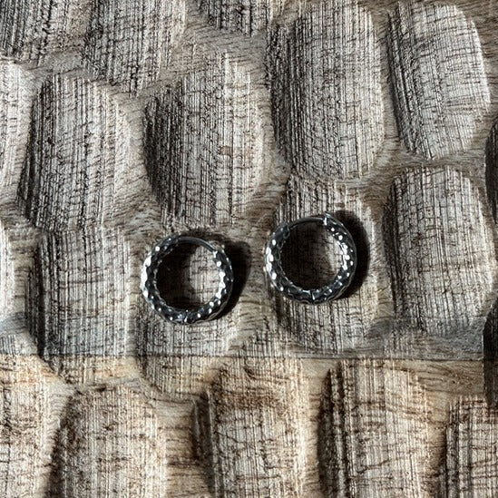 Créoles assorties aux pampilles pommes de pin : Petites rondes martelées dorées ou argentées - 14mm - Acier inoxydable - (Non vendues séparément)